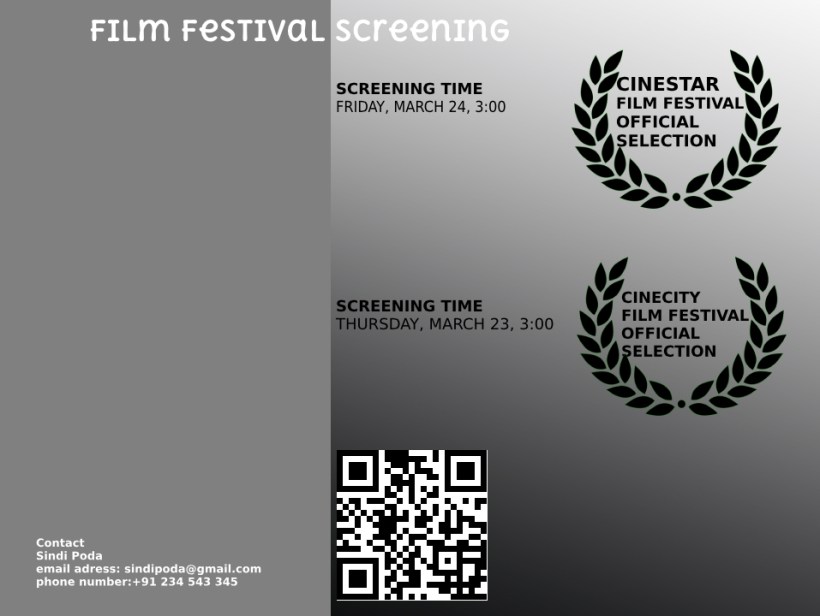 I have finally finished the website and it has come out quite well. It will present the crew in which worked on the movie, the times in which the short film will be on the cinemas. A former invitation to come to the film festival. And a summary about what the movie is going to be all about. I must say that when I first thought of making a website, i thought that i would be stuck and wouldn’t be able to do it. But now I must admit that the experience was quite needed and educational for future purposes.